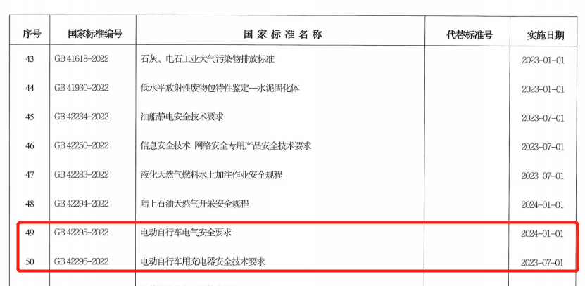 2022年12月29日,國家市場監(jiān)督管理總局、國家標(biāo)準(zhǔn)化管理委員會發(fā)布了GB 42295-2022《電動(dòng)自行車電氣安全要求》、GB 42296-2022《電動(dòng)自行車充電器安全技術(shù)要求》兩項(xiàng)國家標(biāo)準(zhǔn)。
