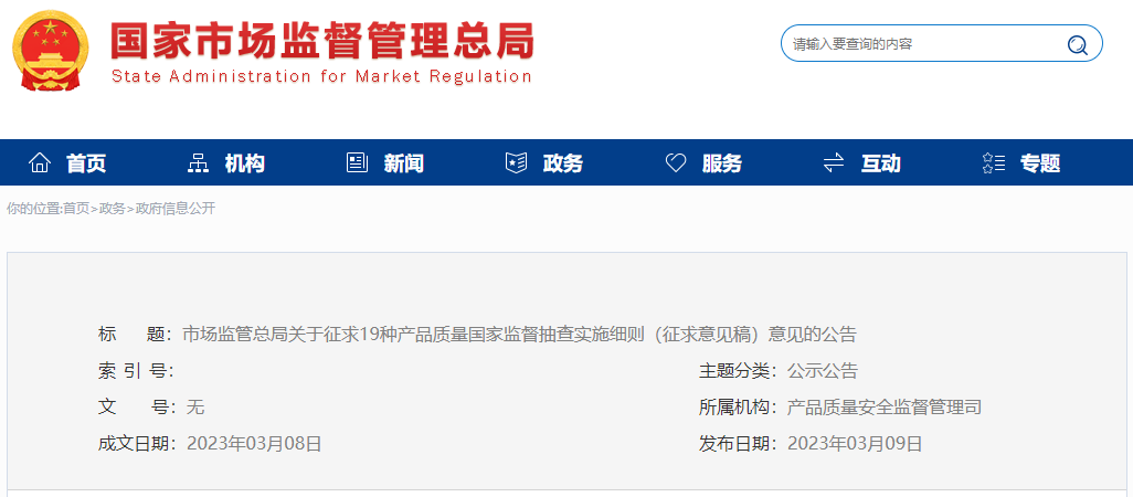市場(chǎng)監(jiān)管總局關(guān)于征求19種產(chǎn)品質(zhì)量國(guó)家監(jiān)督抽查實(shí)施細(xì)則