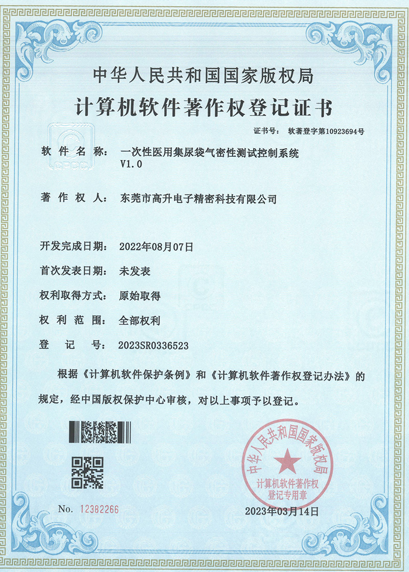 五項計算機軟件著作權登記證書分別是:主動式模擬肺測試控制系統(tǒng)、一次性醫(yī)用集尿袋氣密性測試控制系統(tǒng)、一次性醫(yī)用活檢針穿透力測試控制系統(tǒng)、吸痰管殘留真空測試控制系統(tǒng)、ME醫(yī)用電氣設備變壓器過載短路測試控制系統(tǒng)。