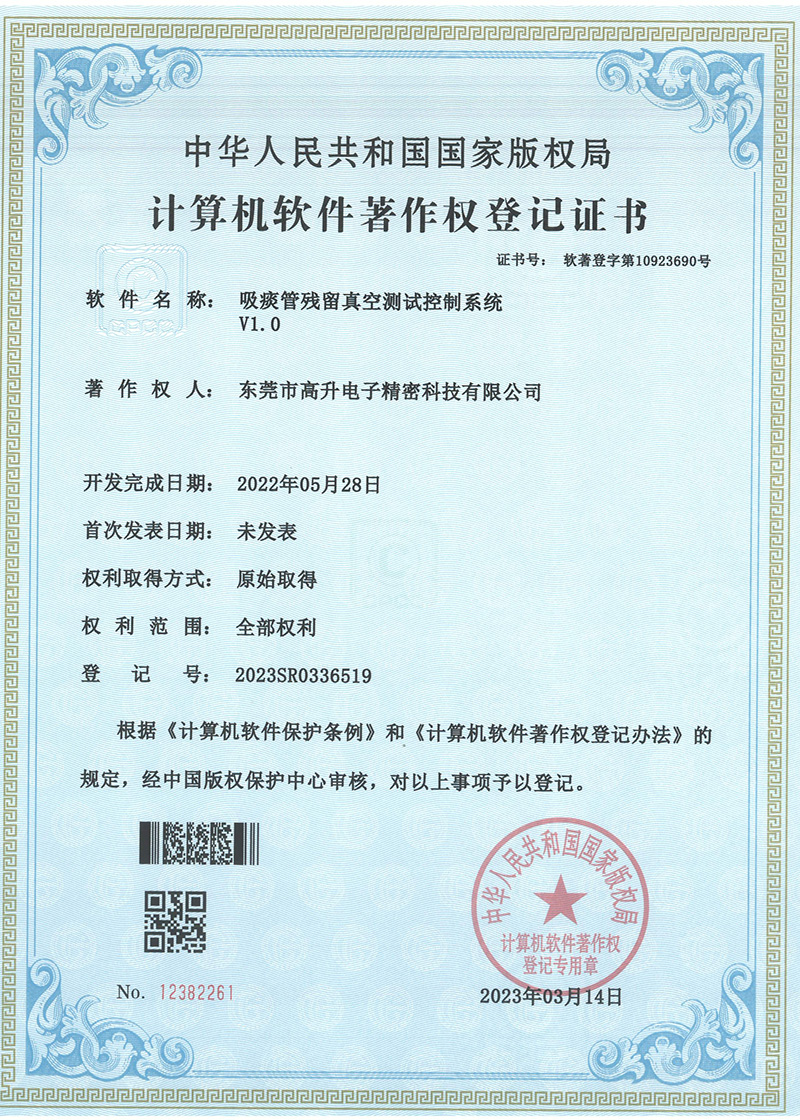 根據(jù)《計算機軟件保護條例》和《計算機軟件著作權登記辦法》的規(guī)定,經(jīng)中國版權保護中心審核,近日,東莞市高升電子精密科技有限公司成功獲得五項計算機軟件著作權登記證書!