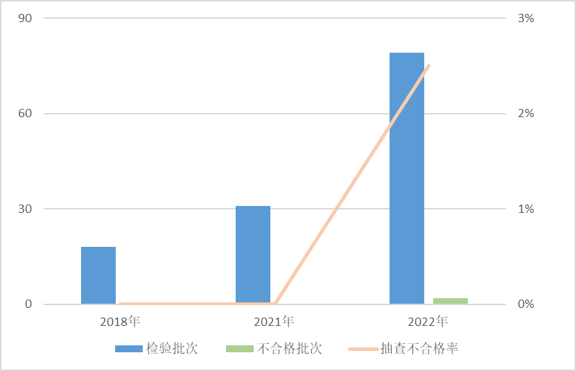 本次在流通領(lǐng)域抽查9個?。ㄊ校?2家企業(yè)生產(chǎn)的79批次產(chǎn)品,發(fā)現(xiàn)2批次產(chǎn)品不合格,抽查不合格率為2.5%,較上次抽查上升2.5個百分點。該產(chǎn)品近3次抽查不合格率分別為0%、0%、2.5%。