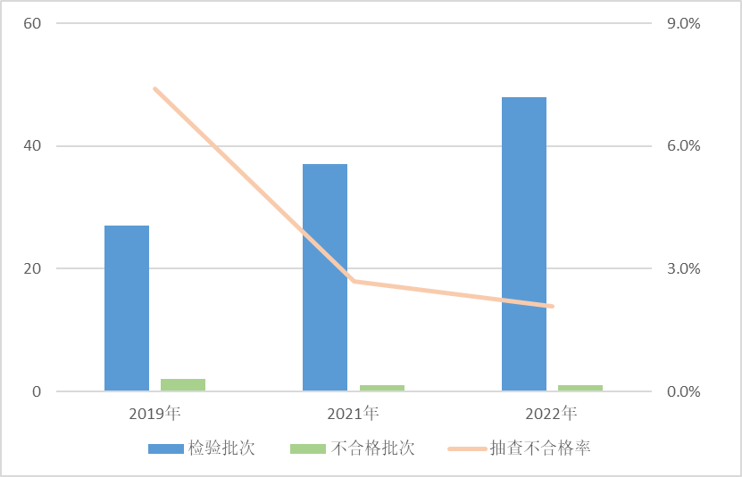 本次在流通領(lǐng)域抽查檢驗4個省(市)32家企業(yè)生產(chǎn)的32批次產(chǎn)品,發(fā)現(xiàn)1批次產(chǎn)品不合格,抽查不合格率為3.1%,較上次抽查下降9.7個百分點。該產(chǎn)品近3年抽查不合格率分別為17.9%、12.8%、3.1%。
