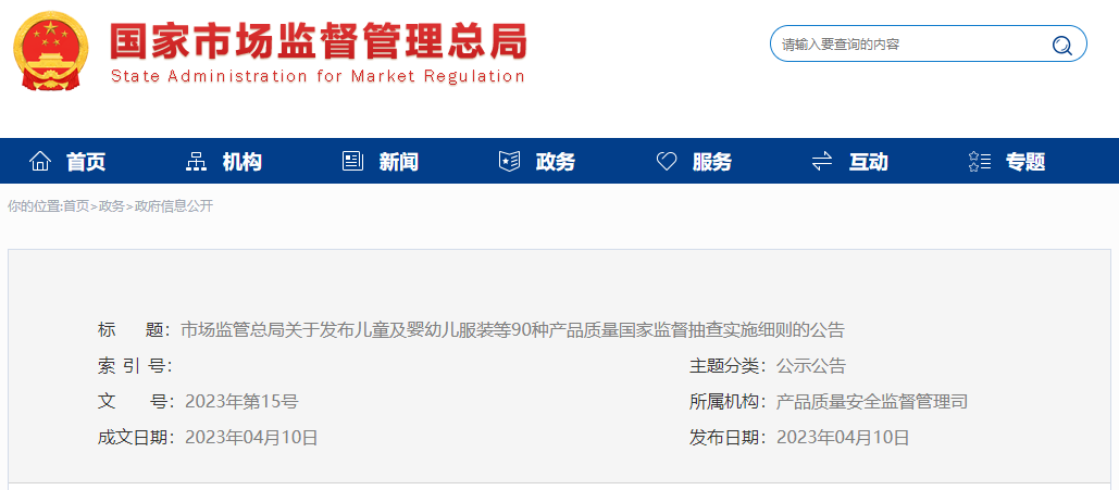 市場監(jiān)管總局關(guān)于發(fā)布兒童及嬰幼兒服裝等90種產(chǎn)品質(zhì)量國家監(jiān)督抽查實施細則的公告