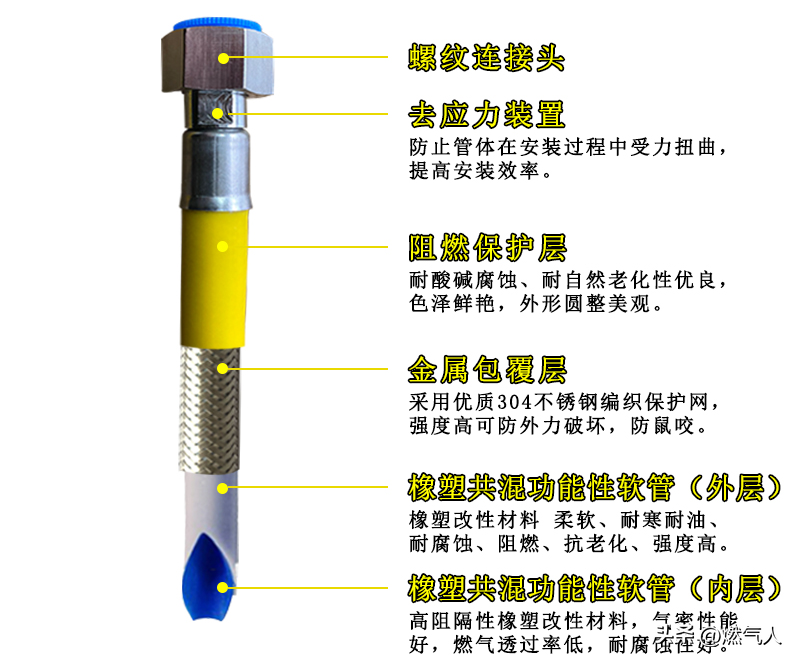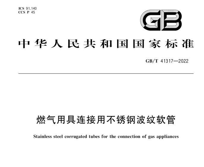 為保障人民群眾用氣安全,遏制燃氣事故發(fā)生,GB/T 41317-2022《燃氣用具連接用不銹鋼波紋軟管》正式批準發(fā)布,自2022年10月1日起實施。燃氣專用連接軟管兩端需有螺紋接頭。