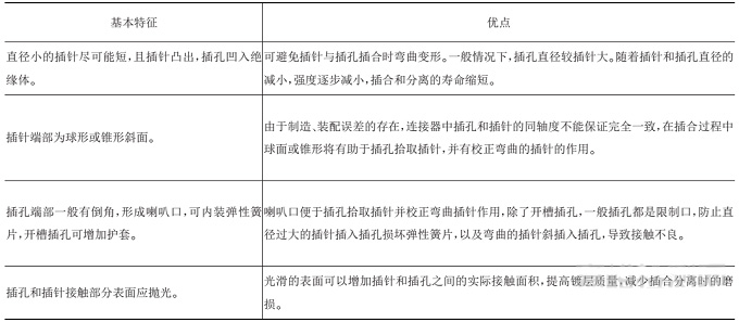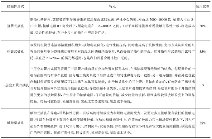 新能源汽車具體應(yīng)用的高壓連接器對(duì)應(yīng)的使用要求相對(duì)而言較多,因?yàn)闉榱酸槍?duì)其應(yīng)對(duì)可能會(huì)出現(xiàn)的各種不可預(yù)知的工況條件,我們所選用的接觸件的基本性能以及結(jié)構(gòu)都需要具有一定的針對(duì)性,其具體的選用結(jié)構(gòu)特征如表一所示。當(dāng)然如果插針的結(jié)構(gòu)基本相同,但是對(duì)應(yīng)的制作材料也是會(huì)存在一定的差別,在我國(guó)其基本材料多是使用銅或銅合金;對(duì)應(yīng)的幾種插孔形式如表二所示。并且表二也簡(jiǎn)述了相應(yīng)的主要特點(diǎn)。