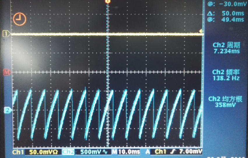 正常工作情況,VCC 5V通過R18||NTC、VR||R9,R7給電容C3充電,IC6腳OSC是輸入input也是輸出output腳,IC6腳周期性給C3放電,形成振蕩波形信號,如圖2所示,供IC內部使用。