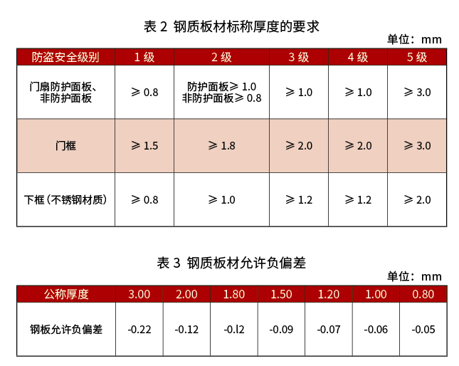 不同防盜安全級別防盜門的門框和門扇面板的標(biāo)稱厚度及厚度偏差應(yīng)符合表2、表3的要求。