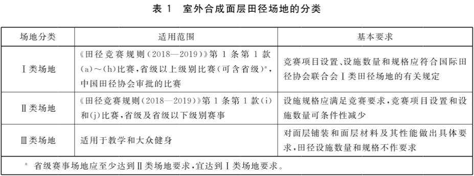 根據(jù)用途、競(jìng)賽級(jí)別、參賽運(yùn)動(dòng)員人數(shù)與水平等因素將室外合成面層田徑場(chǎng)地分為三類,見表1。
