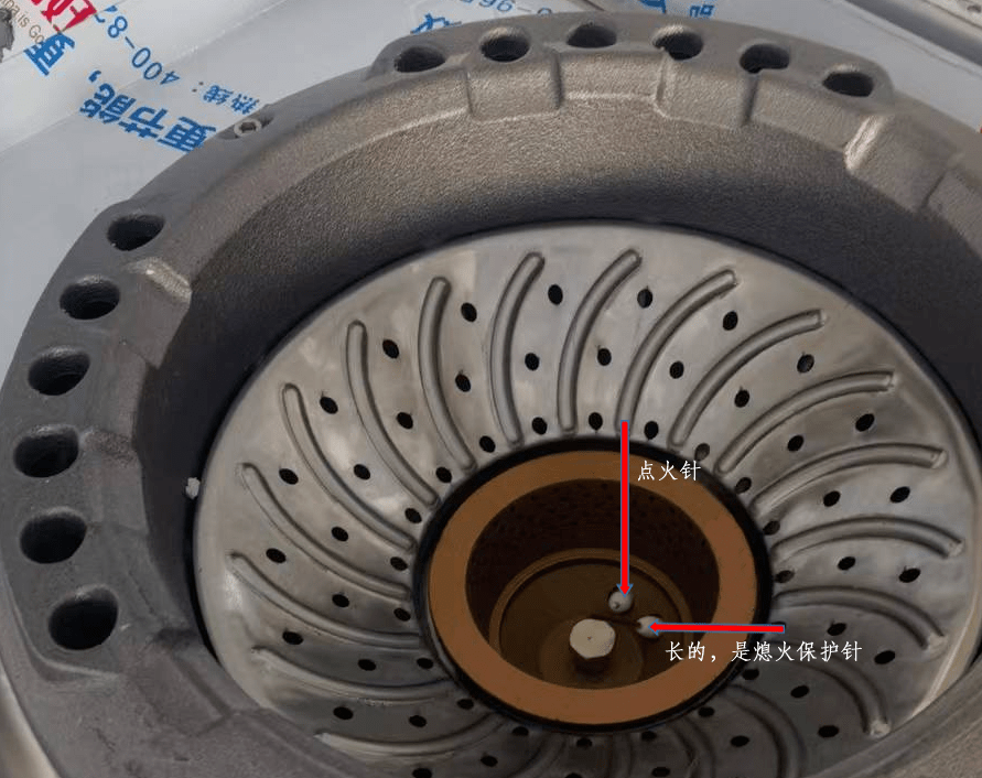 商用燃氣具大多使用熱電式熄火保護裝置,可以在灶頭看到2根針,其中較長的1根金屬針為熄火保護感應針(熱電偶)。同時可進一步查看內部結構,確認有電磁閥、控制器與熄火保護感應針和燃具燃氣管路連接,防止個別生產廠家偷工減料、未安裝完整的熄火保護裝置。另外可調節(jié)的熄火保護裝置也不允許安裝。