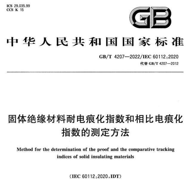 GB/T 4207-2022 《固體絕緣材料耐電痕化指數(shù)和相比電痕化指數(shù)的測(cè)定方法》