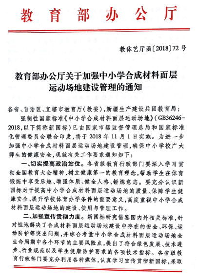 強(qiáng)制性國(guó)家標(biāo)準(zhǔn)GB36246-2018《中小學(xué)合成材料面層運(yùn)動(dòng)場(chǎng)地》(GB36246-2018,以下簡(jiǎn)稱(chēng)新國(guó)標(biāo))已由國(guó)家市場(chǎng)監(jiān)督管理總局和國(guó)家標(biāo)準(zhǔn)化管理委員會(huì)聯(lián)合印發(fā),將于2018年11月1日實(shí)施。為進(jìn)一步加強(qiáng)中小學(xué)合成材料面層運(yùn)動(dòng)場(chǎng)地建設(shè)管理,確保中小學(xué)校廣大師生的健康安全,現(xiàn)就有關(guān)工作要求通知如下: