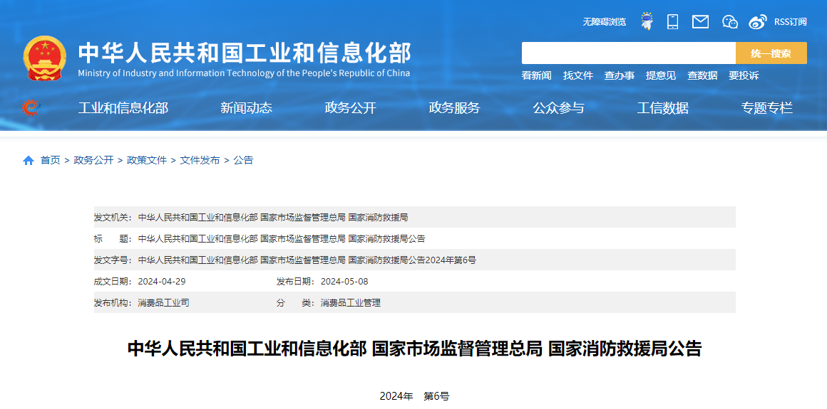 中華人民共和國(guó)工業(yè)和信息化部 國(guó)家市場(chǎng)監(jiān)督管理總局 國(guó)家消防救援局公告