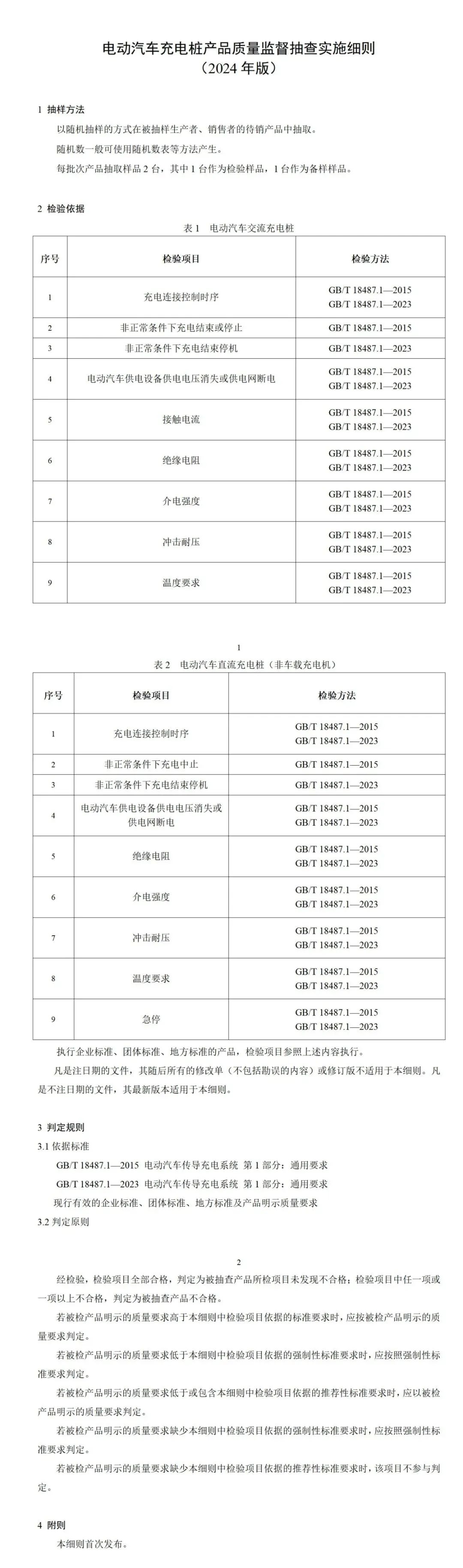 一、《電動汽車充電樁產(chǎn)品質(zhì)量監(jiān)督抽查實施細(xì)則(2024年版)》全文如下:
