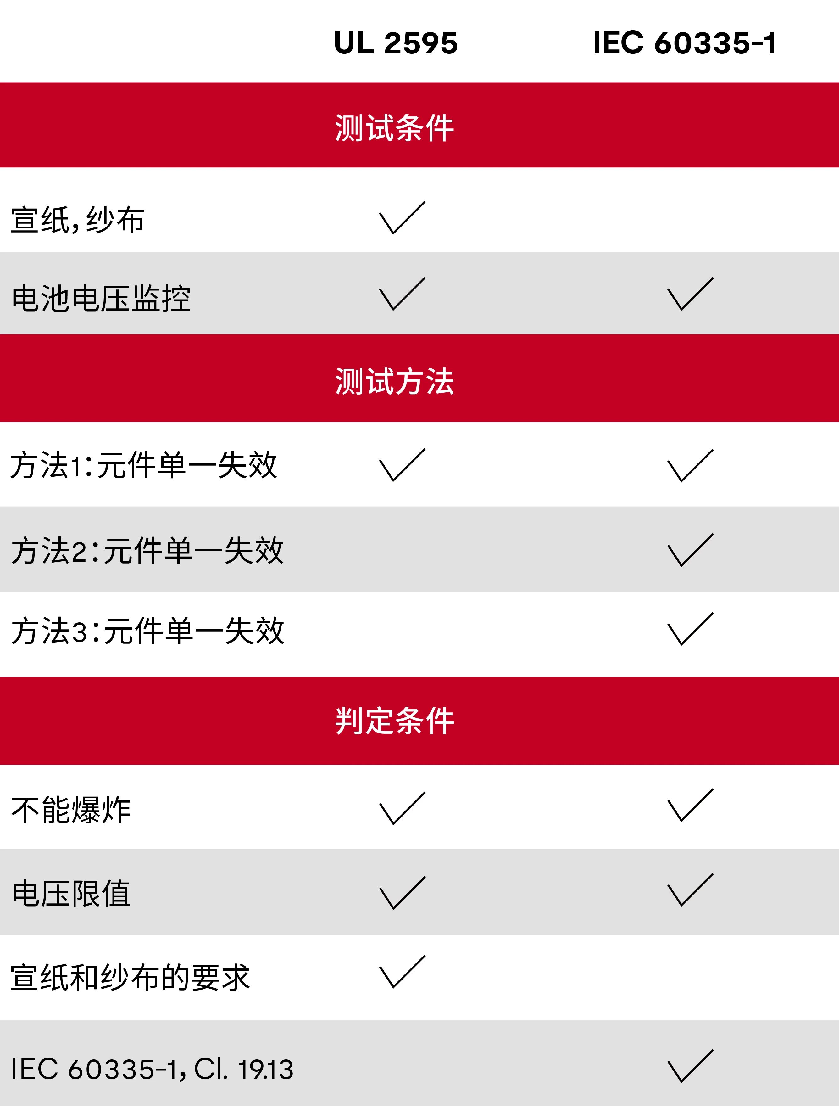 最后我們來總結(jié)一下,針對非正常充電測試,UL 2595和IEC 60335-1:2020中的方法大致相同,但在細節(jié)上有所差異,如下表所示。