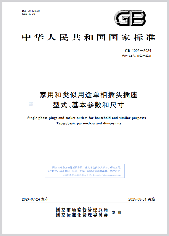 根據(jù)2024年第16號(hào)國家標(biāo)準(zhǔn)公告,GB 1002-2024《家用和類似用途單相插頭插座 型式、基本參數(shù)和尺寸》已批準(zhǔn)發(fā)布,新標(biāo)準(zhǔn)將于2025年8月1日起實(shí)施,代替GB/T 1002-2021 《家用和類似用途單相插頭插座 型式、基本參數(shù)和尺寸》。