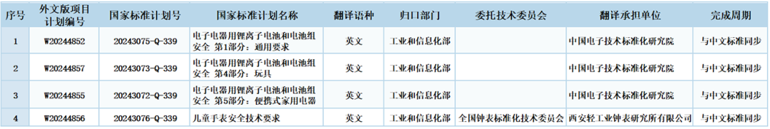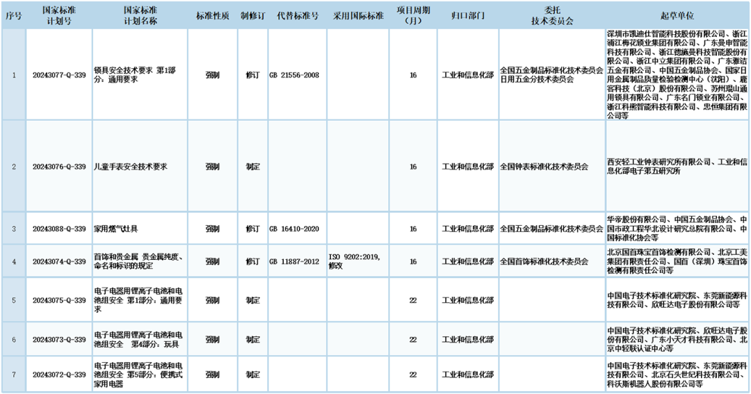 近日,國家標準化管理委員會發(fā)布《兒童手表安全技術(shù)要求》等18項強制性國家標準制修訂計劃及7項強制性國家標準外文版計劃,其中包括《兒童手表安全技術(shù)要求》《鎖具安全技術(shù)要求 第1部分:通用要求》等7項輕工領(lǐng)域強制性國家標準計劃,以及《兒童手表安全技術(shù)要求》《電子電器用鋰離子電池和電池組安全 第1部分:通用要求》等4項輕工領(lǐng)域相關(guān)標準外文版計劃(外文版計劃的語種均為英文),具體如下。