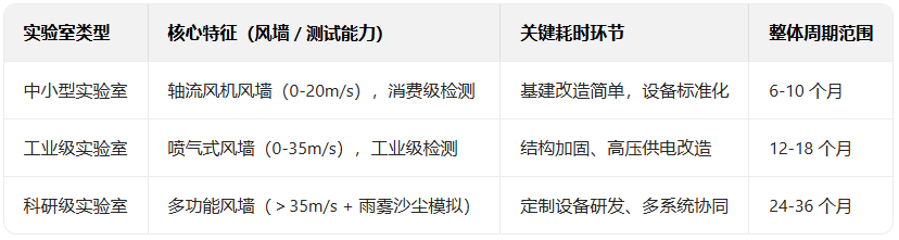 根據(jù)實驗室需求改造現(xiàn)有建筑或新建部分結(jié)構(gòu),工業(yè)級實驗室因需承載噴氣式風(fēng)墻的重量與振動,耗時更長。