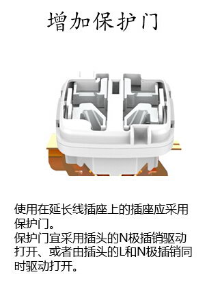 1.增加保護(hù)門:強(qiáng)制要求插線板插孔必須設(shè)置保護(hù)門,避免兒童因?yàn)槭种富蛘呓饘傥矬w誤觸導(dǎo)致觸電事故。