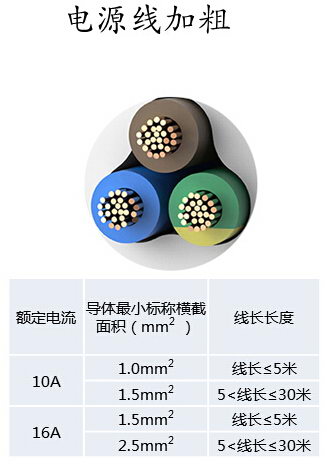 2.電源線加粗:額定電流10A的延長線插座,導(dǎo)線的最小橫截面積由原來的0.75平方毫米提高到1平方毫米;額定16A的則從1平方毫米提高到1.5平方毫米。提高了插座的承載能力,減少由于線纜過載引發(fā)的安全事故。