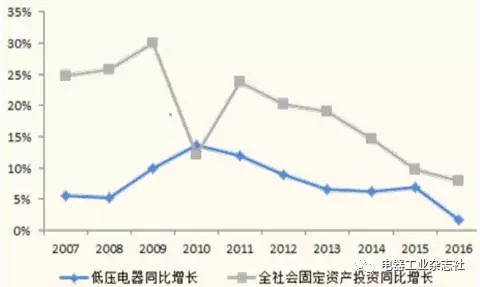 低壓電器市場(chǎng)規(guī)模增長(zhǎng)和全社會(huì)固定資產(chǎn)投資增長(zhǎng)對(duì)比