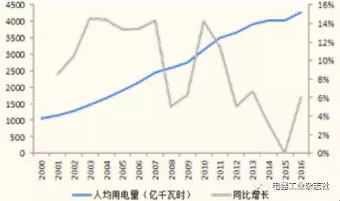 2016年全社會(huì)用電量達(dá)到59198億度,同比增速6.7%,創(chuàng)下近三年最高增速。我國(guó)人均用電量已經(jīng)從2000年的1067度上升至2016年的4406度。但總體上依舊大大落后于世界主要發(fā)達(dá)國(guó)家用電量,我國(guó)人均用電量依然存在非常大的提升空間,這就對(duì)配網(wǎng)和用電側(cè)電氣設(shè)備的容量和質(zhì)量提出了非常高的要求,配電電器和終端電器的新裝量以及巨大的更新?lián)Q代需求將會(huì)持續(xù)利好低壓電器特別是中高端低壓電器的高增長(zhǎng)。