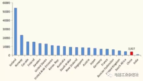 2014年中國(guó)和部分國(guó)家人均用電量對(duì)比